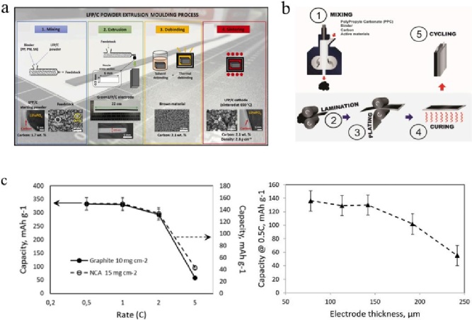 熱熔和擠壓:擠壓法通常需要較高的聚合物含量,這與電極制造不兼容。為解決這個(gè)問題,已經(jīng)嘗試了包括添加溶劑和其他添加劑等多種方法。Sotomayor等人首次將擠壓法用作SF技術(shù),制造使用LTO和LFP等活性材料的電極。通過多次混合和熔融造粒將粘合劑與粉末混合,然后通過擠出機(jī)制備出各種厚度的極片。通過加熱將聚合物從電極上移走,產(chǎn)生內(nèi)部孔隙,擠壓法可以用于制造多孔電極。最后在高溫下燒結(jié)電極,使剩余顆粒之間形成內(nèi)聚力。減少粘合劑的使用對(duì)于進(jìn)一步應(yīng)用于實(shí)際電極制造非常重要。Torre-Gamarra等人采用類似的方法,使用相同的粘合劑系統(tǒng)制造了約500微米厚的無(wú)粘結(jié)自支撐LFP電極(圖4a)。Khakani等人報(bào)道了一種使用碳酸聚丙烯(PPC)和氫化丁腈橡膠(HNBR)作為粘合劑系統(tǒng)的SF擠壓的最新應(yīng)用(圖4b)。成功制造出了LFP、NMC111陰極和LTO陽(yáng)極,其活性材料負(fù)載率為77.5%。Astafyeva等人使用類似的方法,以PPC作為犧牲粘合劑,制造了活性材料負(fù)載率為90%的鎳鈷鋁氧化鋰(NCA)陰極和石墨陽(yáng)極(圖4c)。擠壓法對(duì)顆粒大小敏感,需要準(zhǔn)確控制溫度、剪切力和擠壓時(shí)間。此外,高消耗的聚合物、繁瑣的制造過程以及脫膠和燒結(jié)所需的高溫處理限制了它在實(shí)際電極中的應(yīng)用。