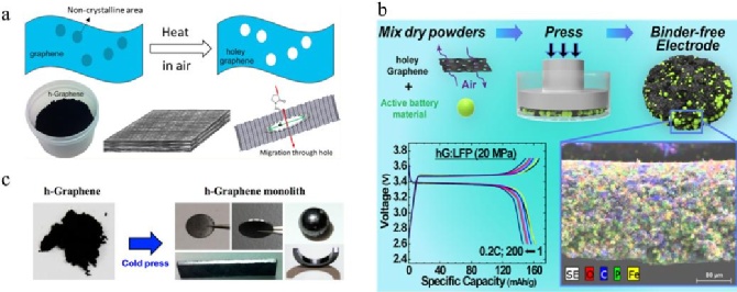 圖5. 基于可壓縮孔狀石墨烯的SF電極制造。(a) 孔狀石墨烯的合成及致密結(jié)構(gòu)的形成。(b) 借助可壓縮孔石墨烯,通過直接壓制制備LFP陰極。(c) 通過直接壓制制備不同形狀的石墨烯單片。