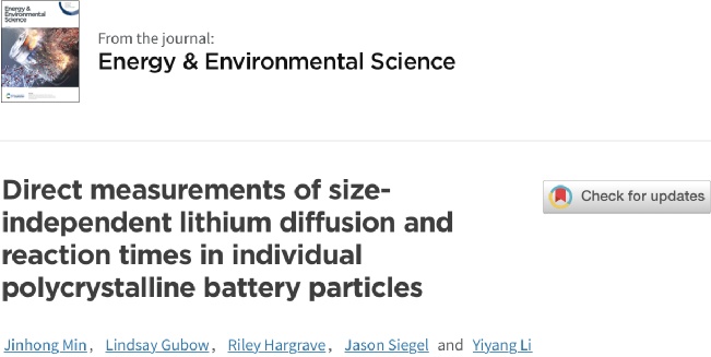 J. Min, L. Gubow, R. Hargrave, J. Siegel and Y. Li, Direct measurements of size-independent lithium diffusion and reaction times in individual polycrystalline battery particles, Energy Environ. Sci., 2023, DOI: 10.1039/D3EE00953J.