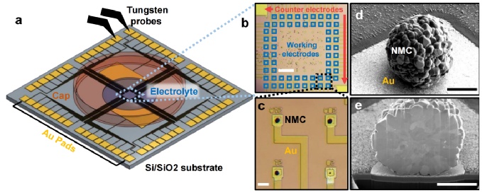 設計了一種多電極陣列,在2厘米長的硅基底上平版印刷的金微電極并在基底上覆蓋了500納米厚的絕緣二氧化硅熱氧化物(圖1a),多電極陣列由62個正方形微電極組成。工作電極由單個NMC532粒子組成(圖1b-d)。為了改善粒子與微電極之間的電氣和物理接觸,在400°C下對芯片進行了1小時的退火處理。接著構建了對/參比電極,兩個電極由部分脫鋰的Li0.6FePO4與PVDF和碳混合而成的漿液組成。對/參比電極的電化學極化可以忽略不計。很難對每個NMC粒子重量進行精確測量,因此使用SEM投影面積來估計顆粒的體積。之后將陣列放置在手套箱中,滴入電解液,組成電池進行測試。