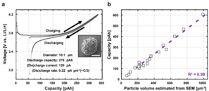 首先以0.22 pA μm-3的恒定電流對21個顆粒進行了電循環。圖2a中顯示了一個代表性粒子的第一次充電/放電和第二次充電曲線;該顆粒的直徑為10.1微米,首次放電容量為278 pAh。繪制了測得的21個顆粒的電化學放電容量與根據掃描電鏡圖像估算的顆粒體積的對比圖(圖2b)。結果顯示,放電容量與體積成正比,這證實了單顆粒電化學和基于顯微鏡的體積估算的可靠性。本實驗中涵蓋了二十個顆粒,遠多于以前只研究一個或幾個顆粒的單顆粒電化學研究。這個較大的數據集對于從統計學角度揭示意想不到的機制至關重要。