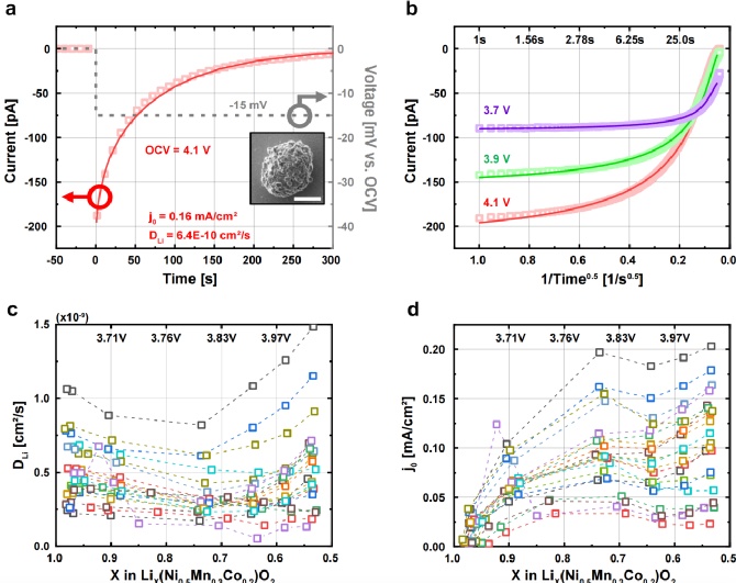 在公式(2)中,I代表電化學電流,t代表時間,B代表比奧數,r代表粒子半徑,R代表氣體常數,T代表溫度,Q代表PITT期間的綜合電化學電荷。公式(2)顯示了j0、DLi和B之間的關系。圖3b顯示了PITT電流響應和3個不同目標開路電位(OCV)時的擬合。通過在低過電位和鋰化過程中進行PITT測量,可以使用公式(1,2)來得到DLi和j0的估計值。隨后,對所有的粒子進行重復的PITT測量,并測量了粒子間DLi和j0的變化。所有電壓下的平均量化DLi和j0標準偏差分別為約1%和約3%,顯示測量結果具有可重復性。圖3c,d是21個粒子的j0和DLi與鋰分數(X)的關系圖。