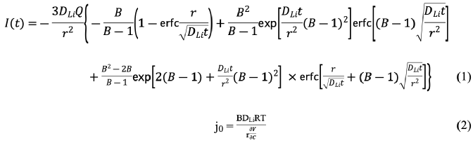 采用恒電位間歇滴定技術(PITT)來測量交換電流密度j0和鋰離子擴散系數DLi。DLi描述了顆粒內離子的擴散速率,而j0用于描述反應速率。為獲得電化學參數 DLi 和 j0,將方程 (1-2) 與 PITT 電流軌跡進行擬合。