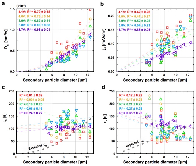 接下來繪制了j0和DLi與二次粒子直徑的函數關系圖(圖 4a,b)。根據定義,j0和DLi都是與尺寸無關的強度屬性。然而,出乎意料的是,j0和DLi似乎都會隨著顆粒尺寸的增大而增大。DLi似乎與二次粒子直徑成二次方比例,j0似乎與直徑成線性比例。顆粒直徑之間存在顯著的統計學相關性。擴散時間用𝜏𝐷=l2/4DLi來定義,其中l是特征擴散長度,假定等于次級粒子的半徑。根據DLi恒定的標準假設,擴散時間𝜏𝐷預計會隨著粒子直徑的增大而二次方增加。然而,本實驗𝜏𝐷與顆粒大小基本無關(圖4c)。對反應時間進行同樣的分析,特征時間常數𝜏𝑅 = 𝑅𝑒𝑠 × 𝐶𝑎𝑝。𝐶𝑎𝑝是每伏特傳輸的法拉第電荷,與粒子的體積成比例。𝑅𝑒𝑠是電荷轉移電阻。根據 j0與尺寸無關的假設,𝜏𝑅應該與顆粒的直徑成正比。然而,圖 4b 中的結果表明,交換電流密度 j0 隨顆粒大小的增加而增加,因此𝜏𝑅與顆粒大小無關。