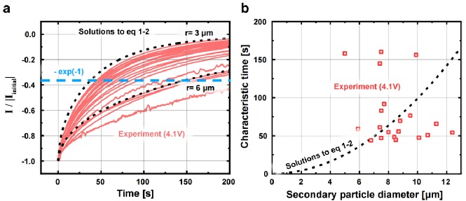 粒子尺寸與𝜏𝐷(擴散時間)和𝜏𝑅(反應時間)之間缺乏預期相關性并非我們擬合過程的誤差。在圖5a中,繪制了所有粒子的電流軌跡I,并在4.1V進行PITT實驗后0.1秒獲得的初始電流Iinit進行了歸一化處理。圖5b繪制了特征時間,即電流衰減到初始電流的37%或[exp(-1)]時的時間,再次顯示與粒子大小無關。方程(1-2)表明,在j0和DLi不變的情況下,該特征時間隨著粒子直徑的增加而增加。這一結果證實,原始電流軌跡中沒有與粒徑相關的𝜏𝐷,這是直接觀察到的,而不是擬合的假象。總體而言,所有這些𝜏𝑅(反應時間)與粒子尺寸相關的電化學參數以及𝜏𝐷(擴散時間)與尺寸無關的觀察結果都與我們對離子嵌入電池材料的標準理解形成鮮明對比。