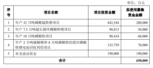 中國粉體網訊 8月11日,湖南裕能發布了向特定對象發行股票預案,本次發行募集資金總額不超過650,000萬元,扣除發行費用后擬全部用于年產32萬噸磷酸錳鐵鋰項目、年產7.5萬噸超長循環磷酸鐵鋰項目、年產10萬噸磷酸鐵項目、年產2萬噸碳酸鋰和8萬噸磷酸鐵的廢舊磷酸鐵鋰電池回收利用項目、補充流動資金。