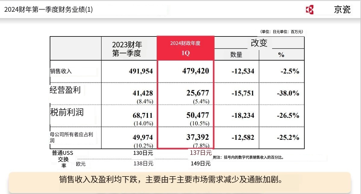 京瓷上季度營收 4794 億日元,同比下降 2.5%,歸母凈利潤為 374 億日元,同比下降 25.2%,營收和利潤下降主要由于零部件市場需求疲軟、通貨膨脹導(dǎo)致原材料價格、能源成本上漲。