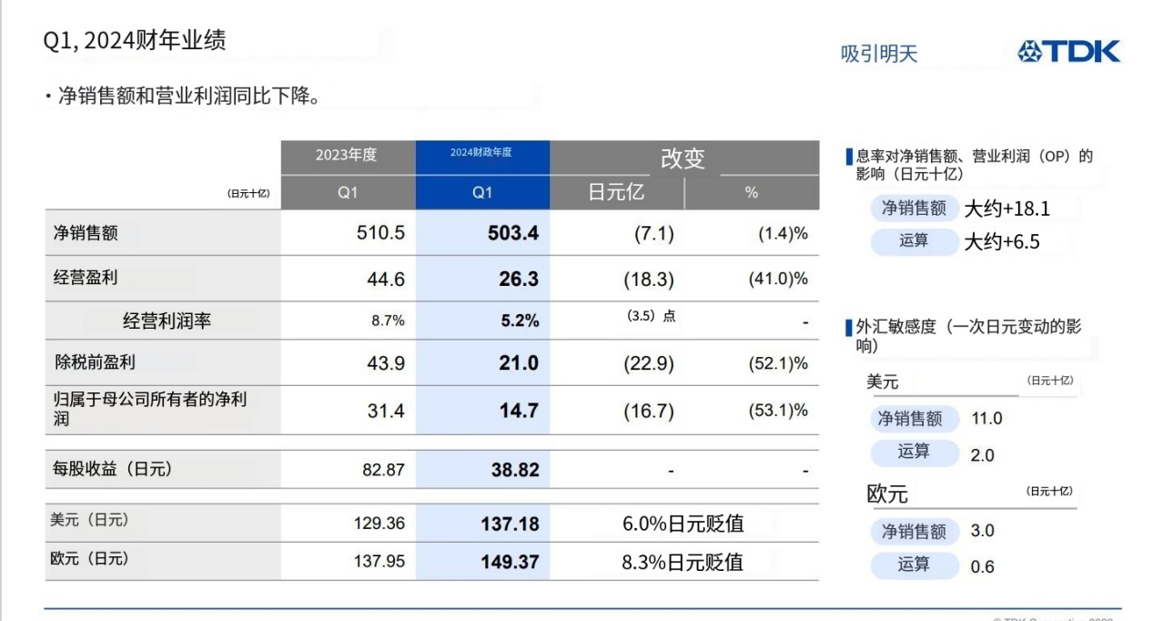 TDK上季度營收5034億日元,同比下降1.4%;歸母凈利潤147.3億日元,同比下降53.1%。