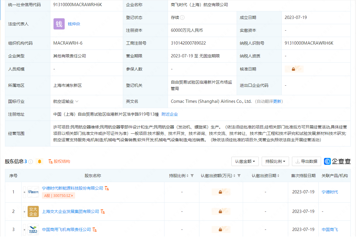 7月19日,商飛時代(上海)航空有限公司成立,經營范圍包含民用航空器維修、民用航空器零部件設計和生產、民用航空器(發動機、螺旋槳)生產等。該公司由寧德時代新能源科技股份有限公司、中國商用飛機有限責任公司、上海交大企業發展集團有限公司共同持股。