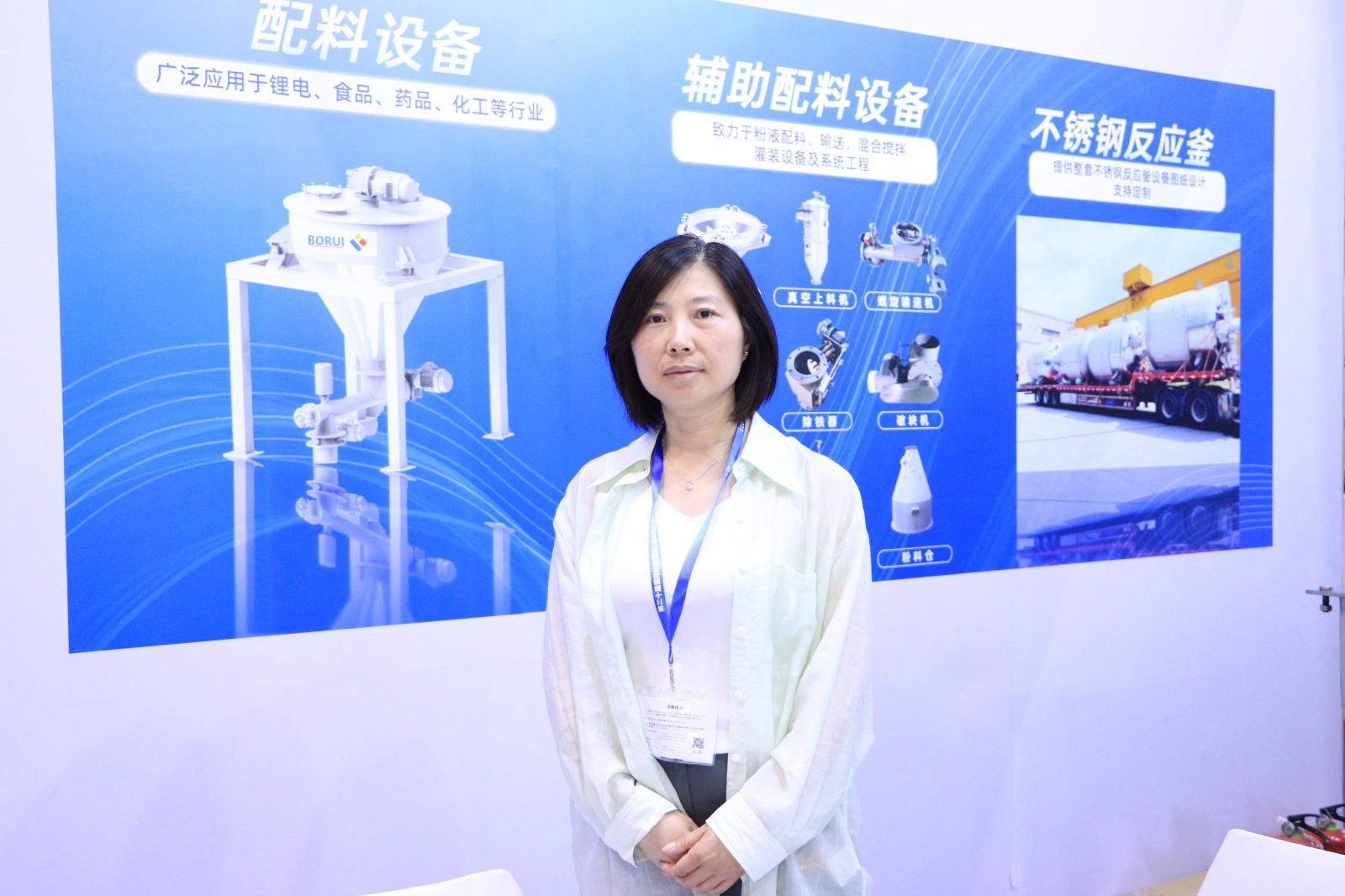 王總:這次展會我們主要帶來了粉體的拆袋設備、真空上料系統、正壓輸送系統,它主要解決客戶粉體的拆袋、輸送、計量等一系列問題,其主要應用領域在化工行業、新能源行業和食品醫藥等行業。