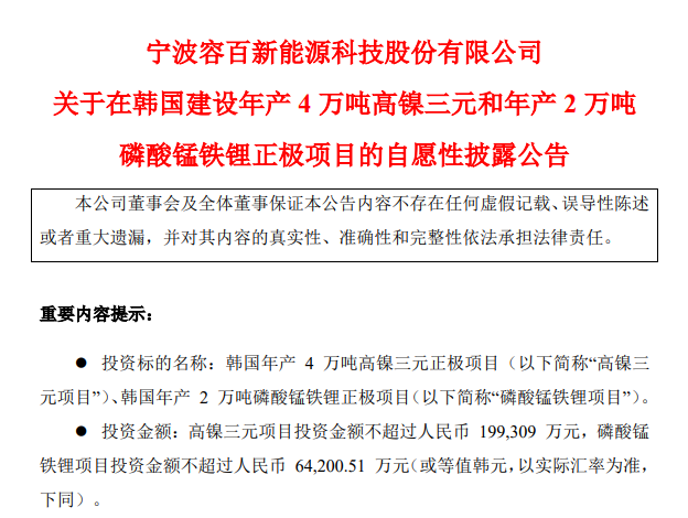 容百科技表示,此次韓國錳鐵鋰工廠的啟動,是國內正極材料企業在境外的首個大規模錳鐵鋰工廠。