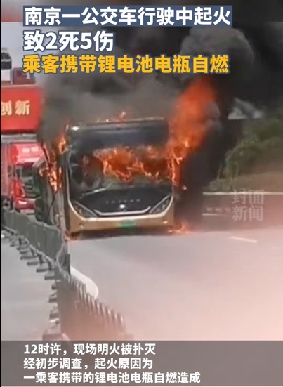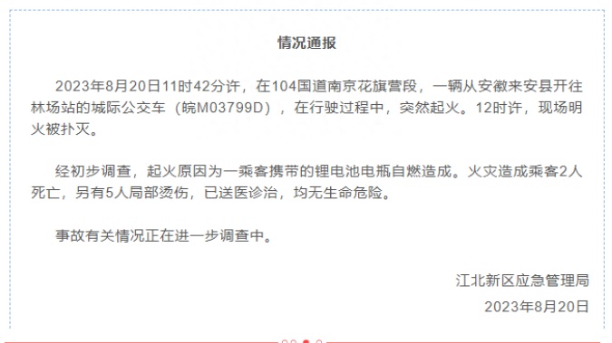 8月20日11時42分許,一輛從安徽來安縣開往林場站的城際公交車在104國道南京花旗營段突然起火,造成乘客2人死亡,另有5人局部燙傷。經初步調查,起火原因為一乘客攜帶的鋰電池電瓶自燃。