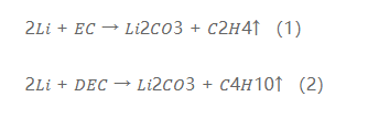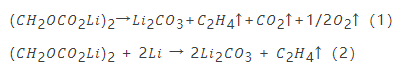 當電池的熱失控開始時,負極材料表面的SEI首先分解。這個過程伴隨著溫度的輕微升高,被認為是熱失控的起始階段。以碳酸乙烯酯為例,反應過程如下: