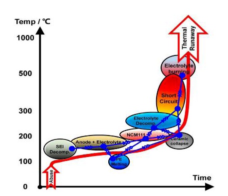熱失控的過程主要包括四種主要的副反應:(1)固體電解質間相(SEI)分解;(2)負極活性物質與電解液的反應;(3)電解液分解;(4)正極活性物質與電解液的反應。