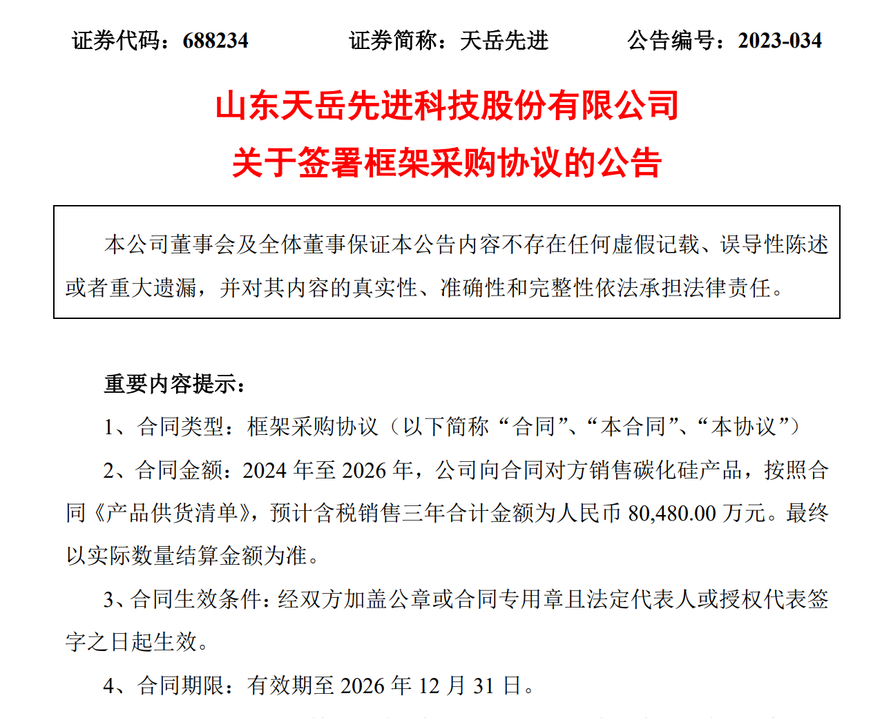 中國粉體網訊 近日,天岳先進發布公告,公司與客戶F簽訂了一份框架采購協議,約定2024年至2026年公司向合同對方銷售碳化硅產品,按照合同《產品供貨清單》,預計含稅銷售三年合計金額為人民幣80,480.00 萬元(最終以實際數量結算金額為準)。