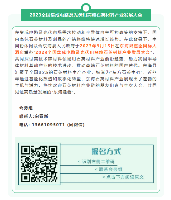 由中國粉體網主辦的“2023全國集成電路及光伏用高純石英材料產業發展大會”將于9月15號在東海舉辦,濰坊追日磁電科技有限公司邀您一同參加。