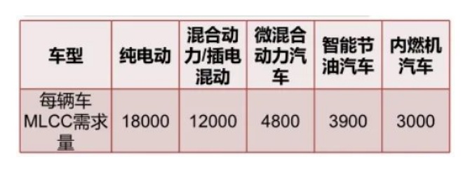 在傳統(tǒng)燃油車中,動(dòng)力系統(tǒng)需約600顆MLCC;安全系統(tǒng)用量最多,大概需要1000-1500顆MLCC;舒適系統(tǒng)需求近1000顆MLCC;娛樂系統(tǒng)也需要500顆以上,并隨著顯示屏等車內(nèi)電子器件的增加而增加。