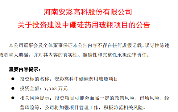 中國粉體網訊 近日,安彩高科發布公告,公司擬在安陽市龍安區產業集聚區投資建設安彩高科中硼硅藥用玻瓶項目(“中硼硅藥用玻瓶項目”)。中硼硅藥用玻瓶項目預計總投資7753萬元,項目建成達產后預計形成年產3億支中硼硅藥用玻璃瓶的生產能力。
