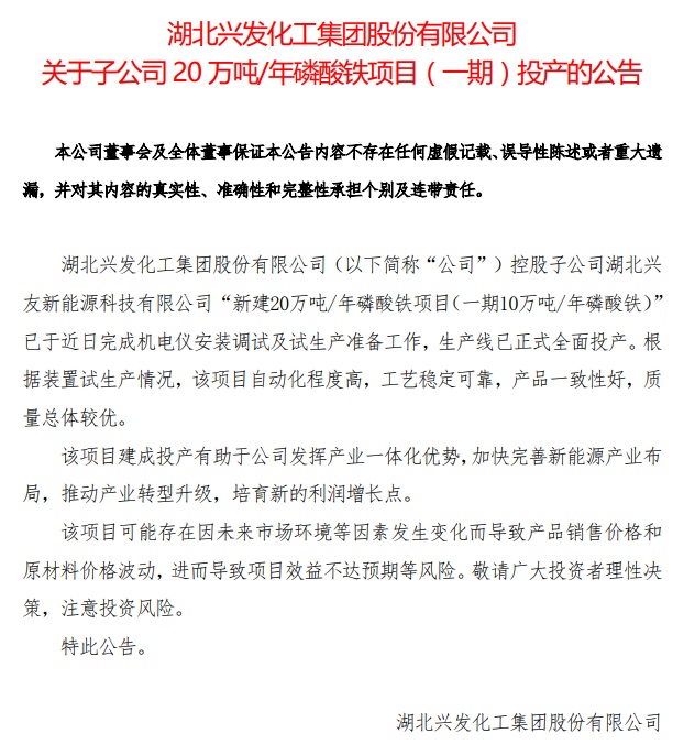 中國粉體網訊 9月4日,興發集團發布公告,控股子公司湖北興友新能源科技有限公司“新建20萬噸/年磷酸鐵項目(一期10萬噸/年磷酸鐵)”已于近日完成機電儀安裝調試及試生產準備工作,生產線已正式全面投產。根據裝置試生產情況,該項目自動化程度高,工藝穩定可靠,產品一致性好,質量總體較優。