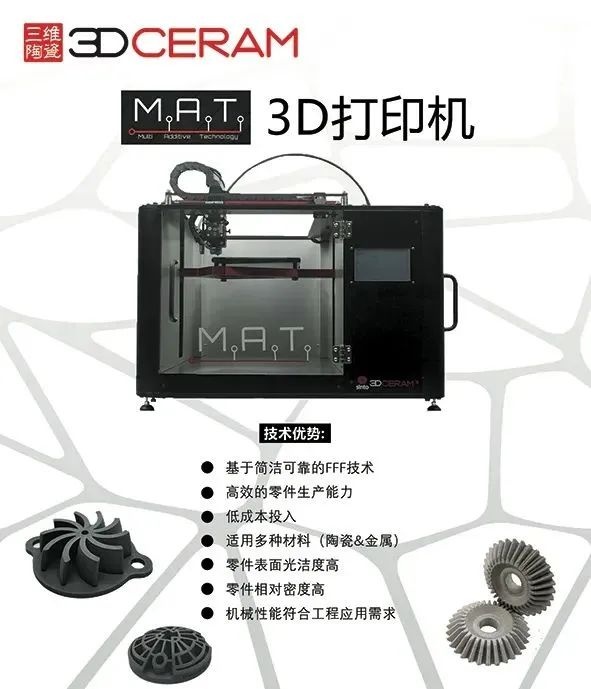 M.A.T不僅能夠進行3DCERAM核心業務的陶瓷3D打印,還能進行金屬材料及復合材料的3D打印。獨特的“coreXY”精準運動系統,可以確保導軌的準確性和穩定性;高性能擠出系統 ,可防止特種絲材斷裂并提供精確線材引導;嵌入式冷卻系統 ,可獲得最可靠的打印效率 ;熱管理打印腔室 ,適用于打印高性能打印材料。一體式的CNC加工系統,可以為工件帶來更好的精度及表面質量。