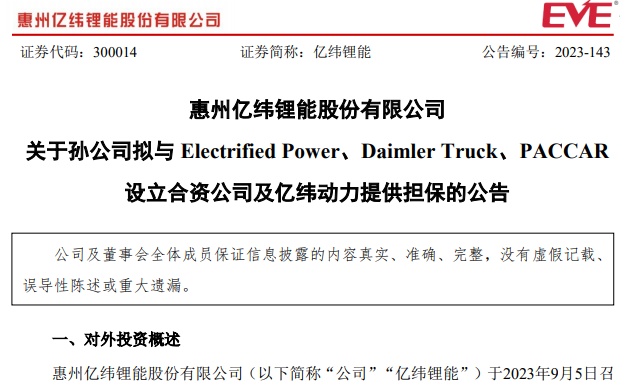 中國粉體網訊 9月6日,惠州億緯鋰能股份有限公司(以下簡稱 “億緯鋰能”)公告表示,其全資孫公司億緯美國與 Electrified Power、Daimler Truck、PACCAR 設立合資公司,在美國投資建設電池產能。其中,億緯美國擬現金出資不超過1.5億美元,持有合資公司10%股權。