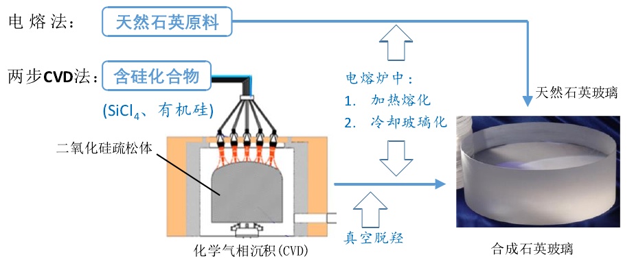 電熔法和兩步 CVD 法制備石英玻璃錠的流程對比圖
