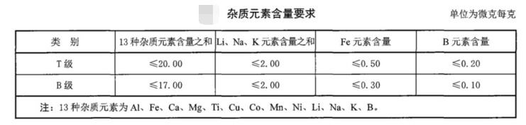 普通石英玻璃晶圓中Al、Fe、Ca、Mg、Ti、Cu、Co、Mn、Ni、Li、Na、K、B等13種雜質(zhì)元素含量的質(zhì)量分?jǐn)?shù)總和應(yīng)不大于25.0μg/g。其中Li、Na、K3種雜質(zhì)元素含量質(zhì)量分?jǐn)?shù)之和應(yīng)不大于3.0μg/g。