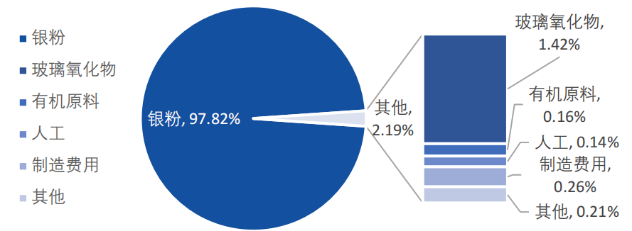 光伏銀漿是制作光伏電池片電極的關鍵材料,是光伏電池片的第一大輔材,同時也是除硅片外,成本占比第二大的光伏材料。