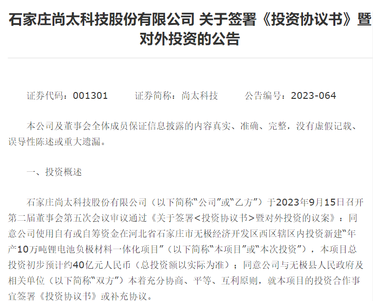 石家莊尚太科技股份有限公司 關于簽署《投資協議書》暨對外投資的公告、尚太科技官網