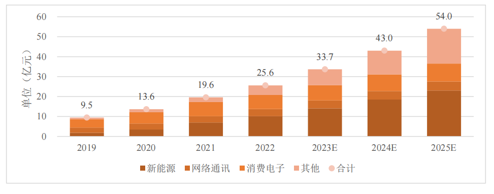 根據(jù)高工產(chǎn)業(yè)研究院數(shù)據(jù),2022年全球?qū)岱垠w材料市場規(guī)模為50.4億元,其中球形氧化鋁導熱粉體市場規(guī)模占比50.8%,為25.6億元,同比增長30.7%。據(jù)壹石通公告,單輛新能源汽車大約需要使用不低于10kg的球形氧化鋁,而且新能源汽車市場仍在快速增長,再加上氧化鋁價格下降使得其在5G、消費電子領域?qū)岱垠w材料中滲透率增加。據(jù)預測2022-2025年全球球形氧化鋁導熱材料市場規(guī)模年復合增速將達28.2%,到2025年將達54.0億元。