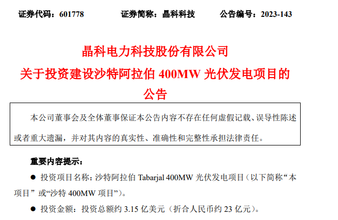參考來源:晶科科技關于投資建設沙特阿拉伯400MW光伏發電項目的公告