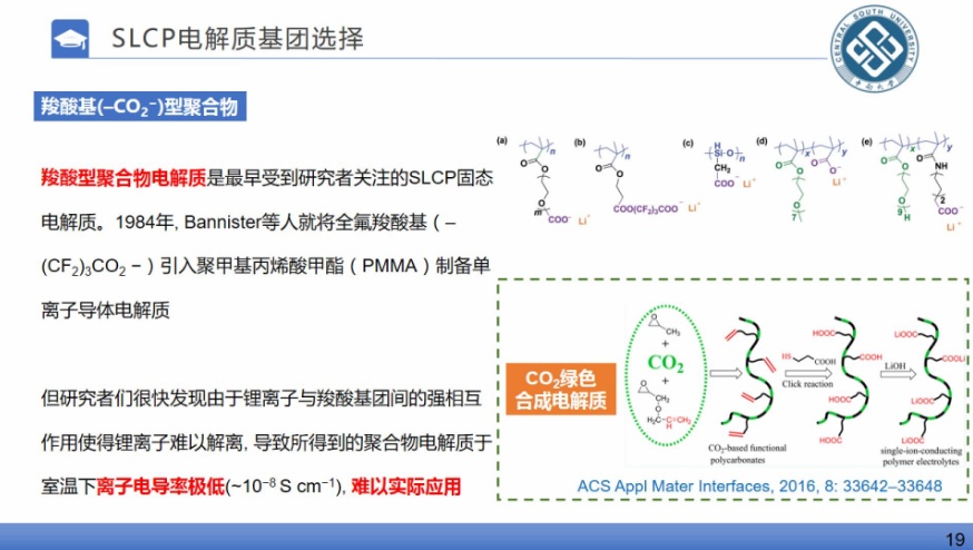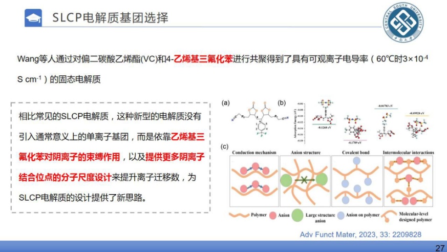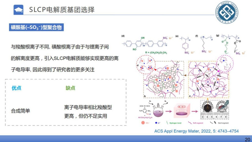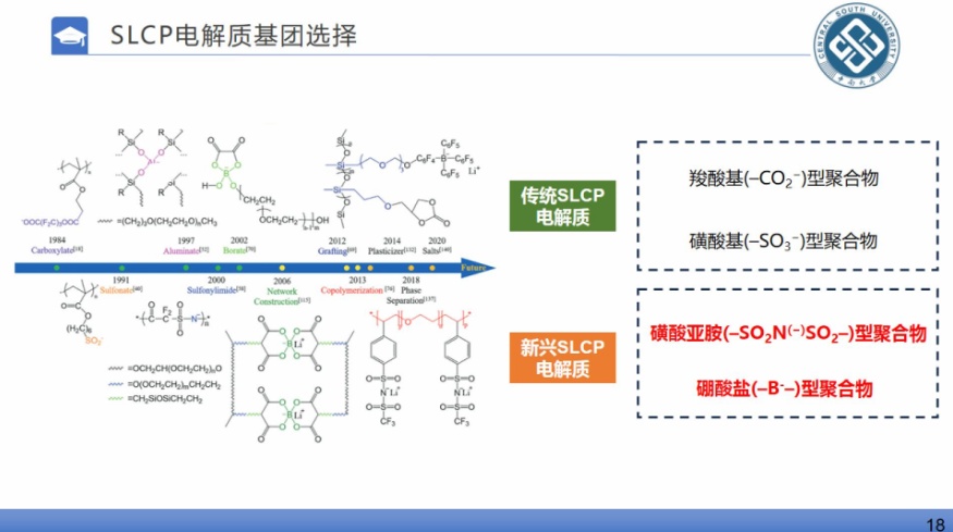 與常見的雙離子導電聚合物電解質不同,單鋰離子導電聚合物(SLCP)電解質是通過引入特殊基團,將陰離子束縛固定以限制其遷移,從而實現由鋰離子遷移為主的導電機制,其鋰離子遷移數通常高于0.5,理論上可以達到1。高的鋰離子遷移數會大幅度降低濃差極化,抑制鋰枝晶的生長,提升固態電池的充放電循環性能。SLCP固態電解質既可以解決界面問題又可以解決鋰枝晶問題。