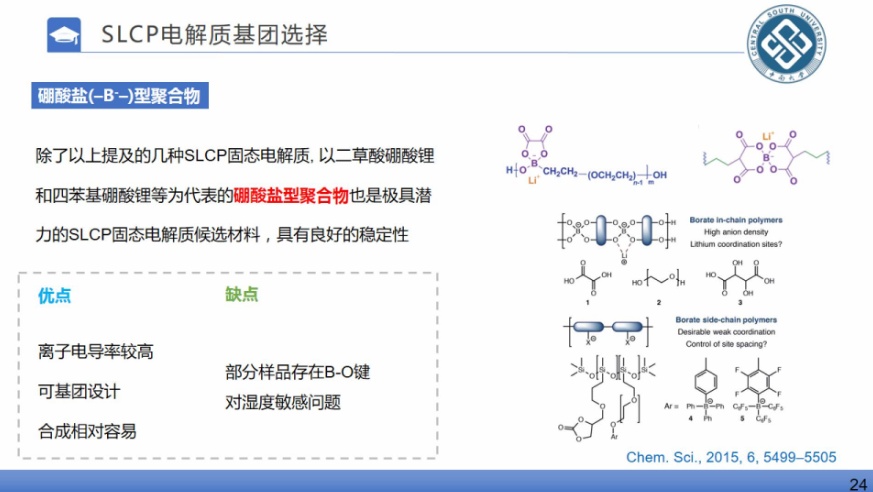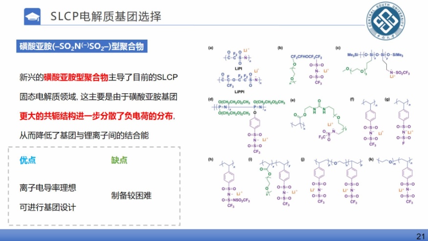 隨后劉洪濤教授列舉了構建SLCP固態電解質的幾種陰離子結構基團及其優缺點: