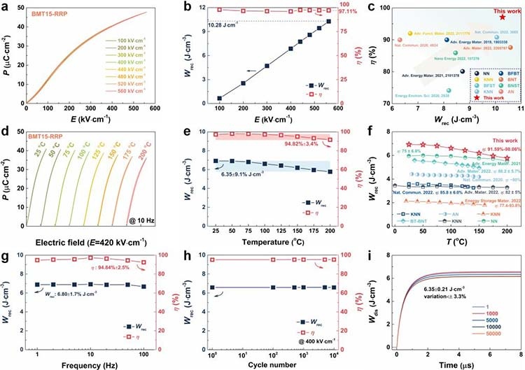 圖2.BMT15-RRP陶瓷在不同測試條件下(電場、溫度、頻率和循環次數)的儲能特性