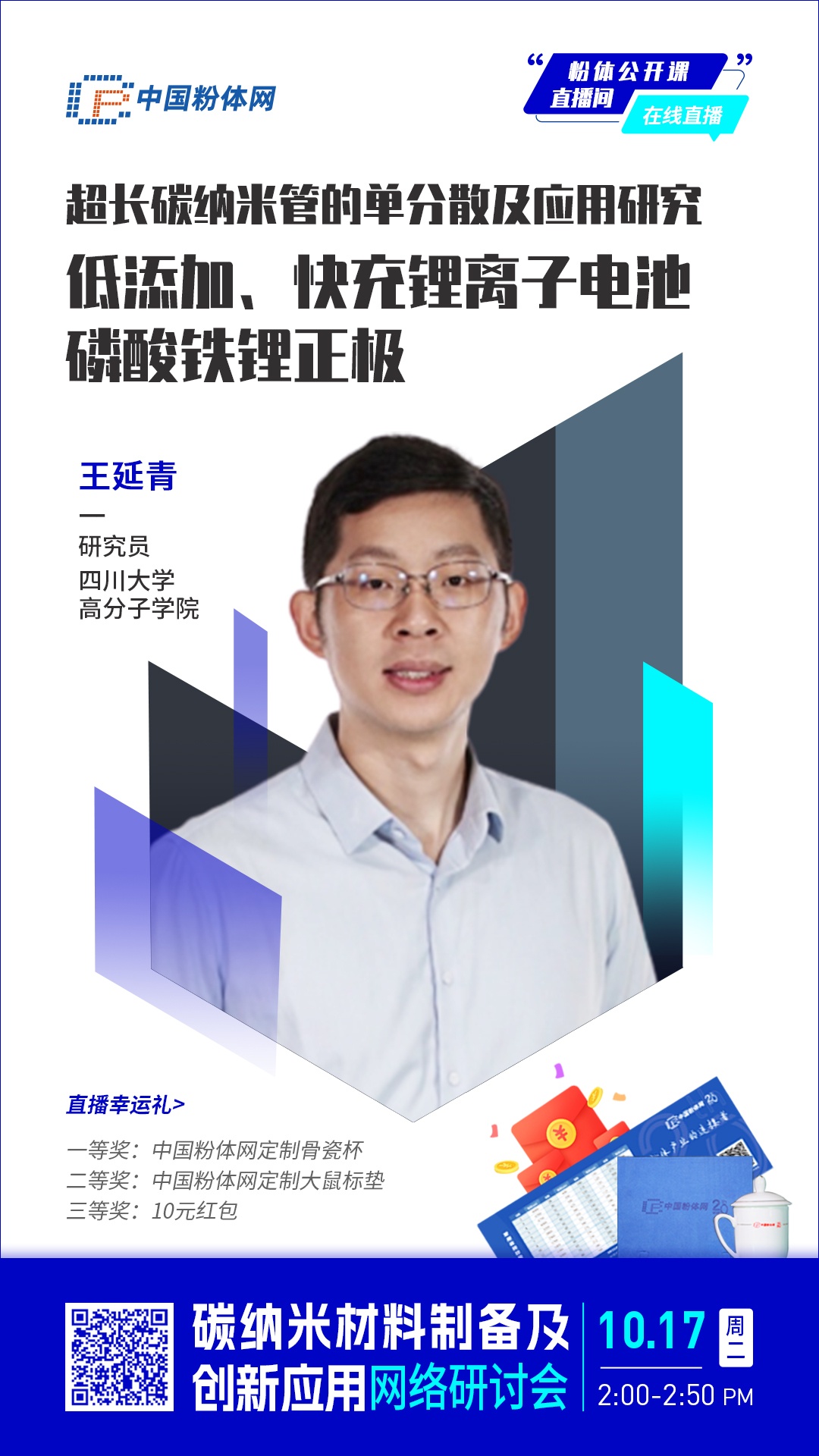 嘉賓介紹:王延青,四川大學高分子科學與工程學院特聘研究員,于2010-2019年在日本北海道大學、東京大學攻讀博士學位及開展博士后研究,在2019年以“雙百人才 B 計劃”全職回國新成立先進碳與能源材料研究室并獨立開展研究,先后入選四川省“青千”計劃、四川省“海外高層次人才引進計劃”特聘專家、天府峨眉計劃創業領軍人才等。主持和承擔了國家自然科學基金重點項目、人力資源社會保障部中國留學人員回國創業啟動支持計劃、省科技廳項目等近10項。主要從事超長碳納米管的單分散原理、碳基材料的設計制備及其在能源、環境相關領域的應用研究,主要包括:超長碳納米管在非/弱極性有機體系的分散研究、新型高倍率快充鋰電池導電劑、低溫鋰電池負極、鈉電池硬碳負極、電磁屏蔽/吸波材料、超級電容器、碳基導熱/散熱材料、柔性顯示材料、先進高分子功能材料等。在Advanced Science,Carbon,Chemical Engineering Journal,Small,J Mater Chem A,Energy Storage Materials等高水平學術期刊上發表論文50余篇。 研究成果獲得了山東省科技進步一等獎、國家優秀自費留學生獎學金、中國專利優秀獎、山東省專利獎、四川省特聘專家、JSPS外國青年學者研究獎勵、北海道大學私費外國人留學生特待制度、四川大學優秀科技人才獎、鹽都特聘專家等。