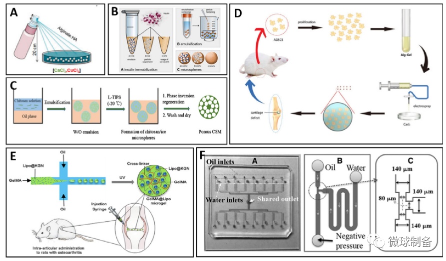 圖片水凝膠微球制備技術示意圖。A噴霧法、B乳液聚合、C相分離、D電噴霧、E微流體技術、F微流控芯片