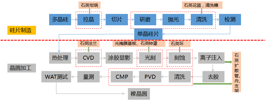 另一方面,不同應用細分領域對于石英玻璃特性需求有所差異。如半導體領域,在高溫區使用的石英玻璃制品要求低羥基含量,通常使用電熔方法制備;低溫區材料則更多考慮氣熔石英玻璃;而在掩膜基板生產中則更多使用雜質含量低、透光率高的合成法制備的石英玻璃。