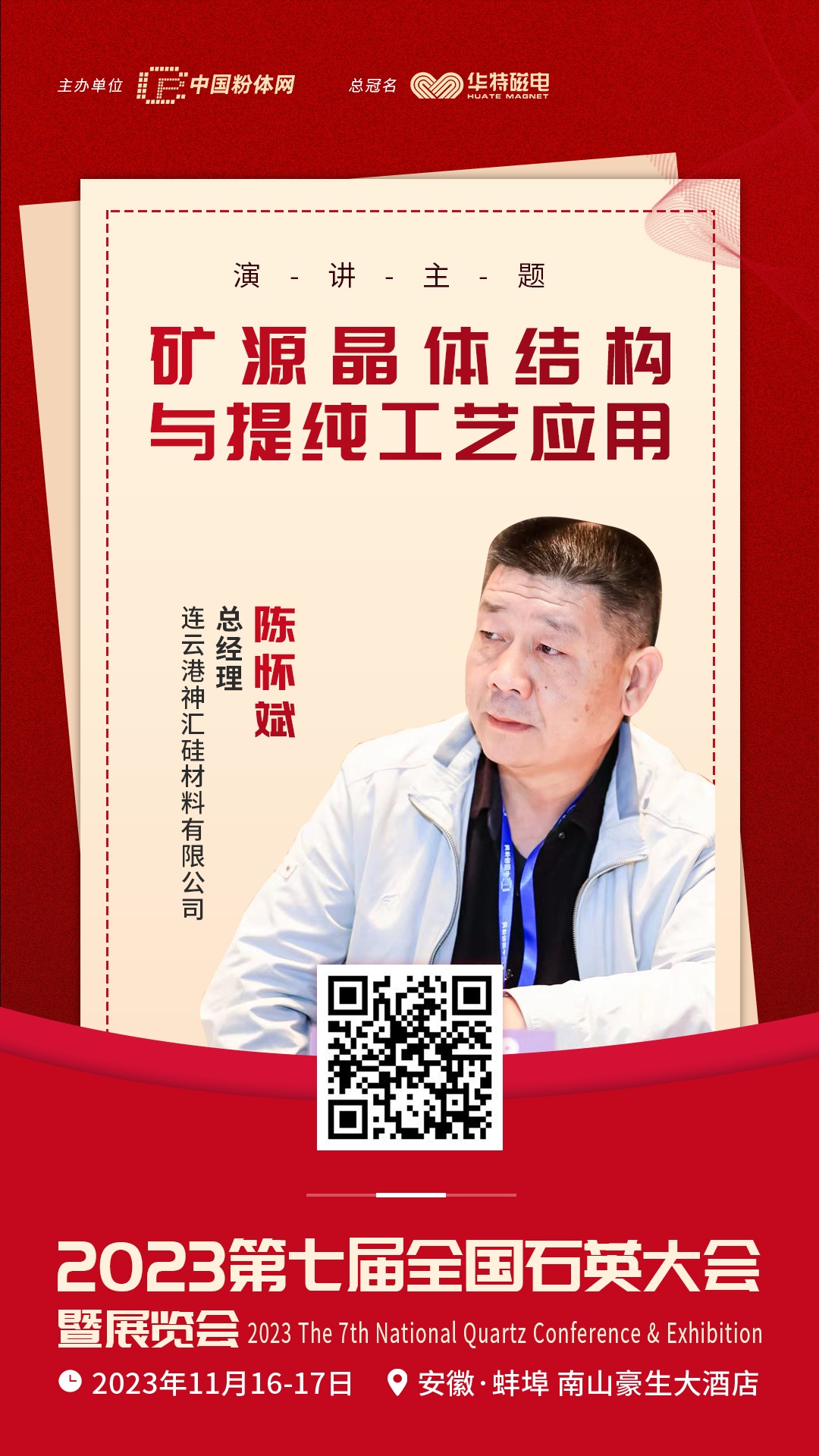 2023年11月16~17日,由中國粉體網主辦的“2023(第七屆)全國石英大會暨展覽會”將于安徽蚌埠召開,屆時連云港神匯硅材料有限公司總經理陳懷斌將做《礦源晶體結構與提純工藝應用》的報告。歡迎感興趣的朋友親臨現場,聆聽專家的精彩報告!