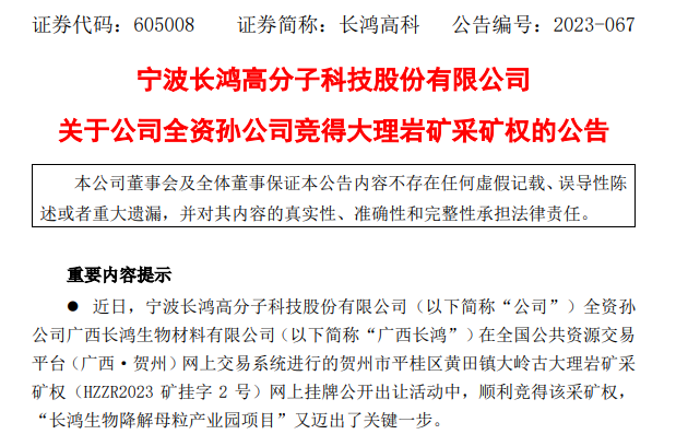 9月21日,廣西長鴻生物材料有限公司以13,980萬元順利取得賀州市平桂區黃田鎮大嶺古大理巖礦采礦權,“長鴻生物降解母粒產業園項目”又邁出了關鍵一步。據了解,該采礦權礦區位于賀州市平桂區黃田鎮,礦區面積0.5908平方公里,目前累計查明大理巖礦(推斷+控制)資源量為8185.79萬噸,生產規模為269萬噸/年。