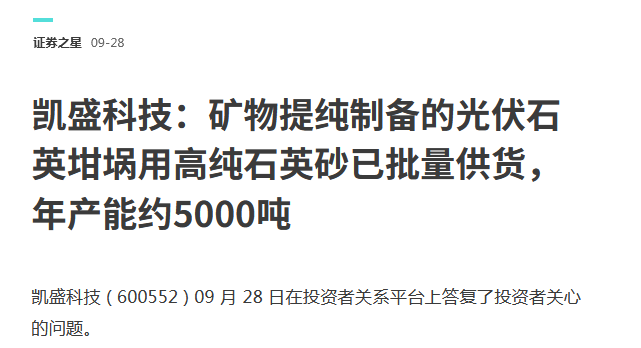 凱盛科技:礦物提純制備的光伏石英坩堝用高純石英砂已批量供貨,年產能約5000噸
