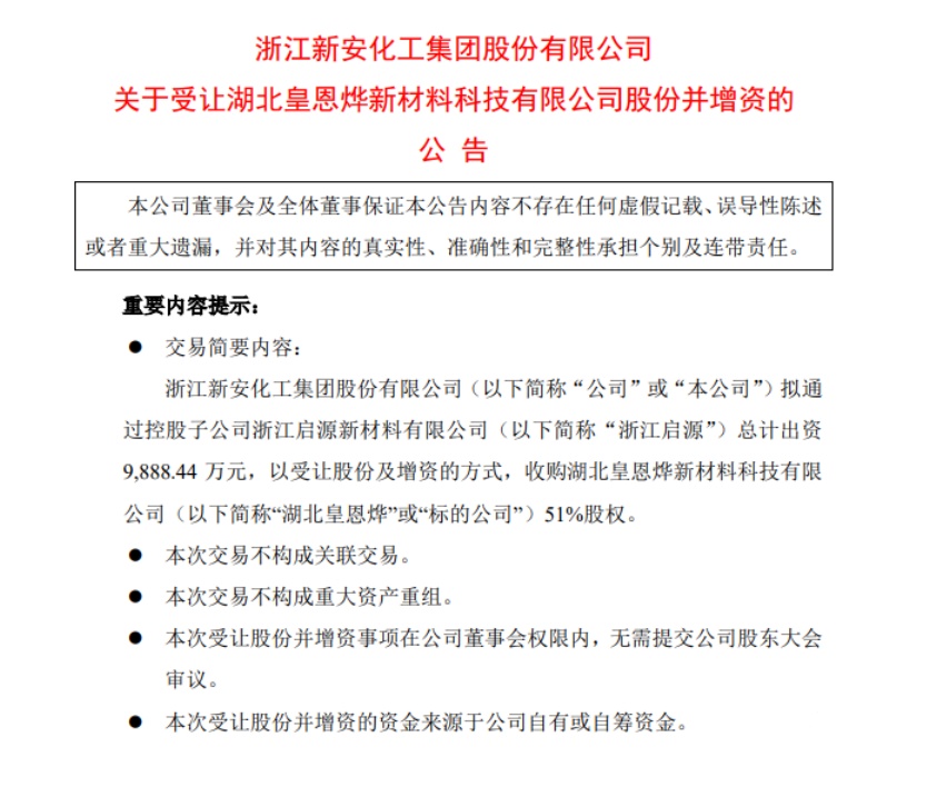 10月11日,新安股份公告,為進一步落實公司向新能源產(chǎn)業(yè)拓展的戰(zhàn)略部署,公司擬通過控股子公司浙江啟源新材料有限公司的自有或自籌資金,以受讓股份及增資的方式,收購湖北皇恩燁新材料科技有限公司51%股權(quán)。新安股份表示,近年來,國內(nèi)負極材料產(chǎn)量隨著電池出貨量的快速增長不斷提高,其中產(chǎn)量最大的為人造石墨負極,其無論從循環(huán)性能、安全性能、充放電倍率表現(xiàn)等方面均更優(yōu)于天然石墨,因此占據(jù)市場主流。