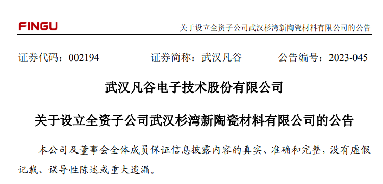 武漢凡谷設立新子公司,聚焦陶瓷材料