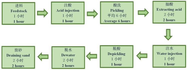 開啟電加熱裝置配兌酸液加熱備用,將物料通過輸送方式進入提升機(或輸送帶),經提升機(或輸送帶)將物料送入酸洗反應罐。將配兌好的酸液經酸泵抽入酸洗反應罐內,酸洗進入物料時間約一小時,開啟酸循環。酸液反應溫度控制為60~75℃(自動恒溫),開啟空壓機,使物料在反應罐中翻滾,達到物料受酸均勻目的,物料酸洗時間為4~8小時(視物料及產品要求而定),加熱酸洗過程中所產生的酸霧經過堿水噴淋后經酸霧凈化系統達標排放。酸洗完畢酸液抽至儲酸罐儲存進行循環使用,酸洗反應罐內裝有脫酸篩網,達到酸砂分離目的,篩網目數根據物料要求粒度選裝。
