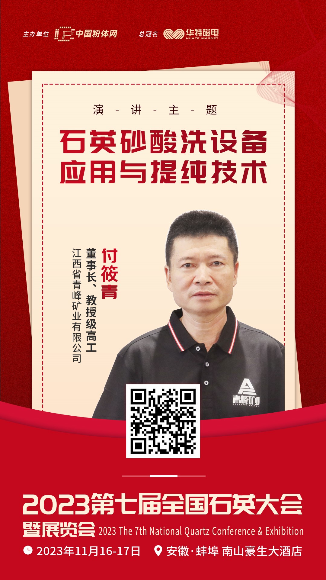 2023年11月16-17日,中國粉體網將于安徽·蚌埠南山豪生大酒店舉辦“2023(第七屆)全國石英大會暨展覽會”。來自江西省青峰礦業有限公司的董事長/教授級高工付筱青將作《石英砂酸洗設備應用與提純技術》報告。