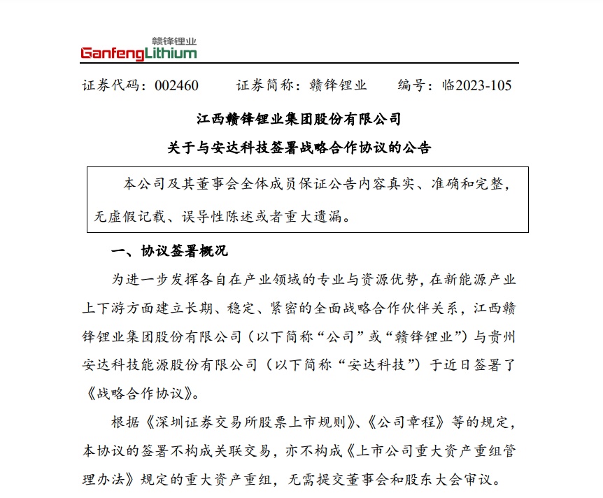 10月16日,贛鋒鋰業(yè)發(fā)布公告稱,公司與貴州安達(dá)科技能源股份有限公司(簡稱“安達(dá)科技”)于近日簽署了《戰(zhàn)略合作協(xié)議》。公告顯示,雙方將開展多領(lǐng)域合作,在鋰鹽產(chǎn)品供應(yīng)方面開展供應(yīng)鏈深度合作;在磷酸鐵鋰正極產(chǎn)品供應(yīng)方面開展供應(yīng)鏈深度合作;拓展鋰鹽產(chǎn)品的應(yīng)用領(lǐng)域,在新產(chǎn)品開發(fā)、應(yīng)用研究等領(lǐng)域開展合作。同時(shí),為進(jìn)一步提升雙方的產(chǎn)業(yè)競爭力,贛鋒鋰業(yè)和安達(dá)科技基于各自的產(chǎn)業(yè)優(yōu)勢,擬共同成立合資公司以投資建設(shè)年產(chǎn)2萬噸磷酸鐵鋰正極材料制造項(xiàng)目。合資公司注冊資本5000萬元人民幣,贛鋒鋰業(yè)持股40%,安達(dá)科技持股60%。