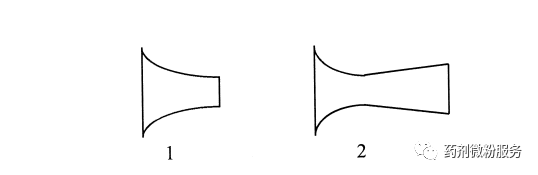 噴嘴最常見的是突變型(圖1),在喉部提供聲速。出口壓力約為初始氣體壓力的50%,氣體膨脹發生在噴嘴喉部之外,從而循環氣體并促進顆粒碰撞。另一種是拉瓦爾形噴嘴(圖2)。在這種情況下,氣體在擴張部分膨脹,變成亞音速度,增加射流的作用以及循環氣流的速度,進而提高生產能力和粉碎細度。