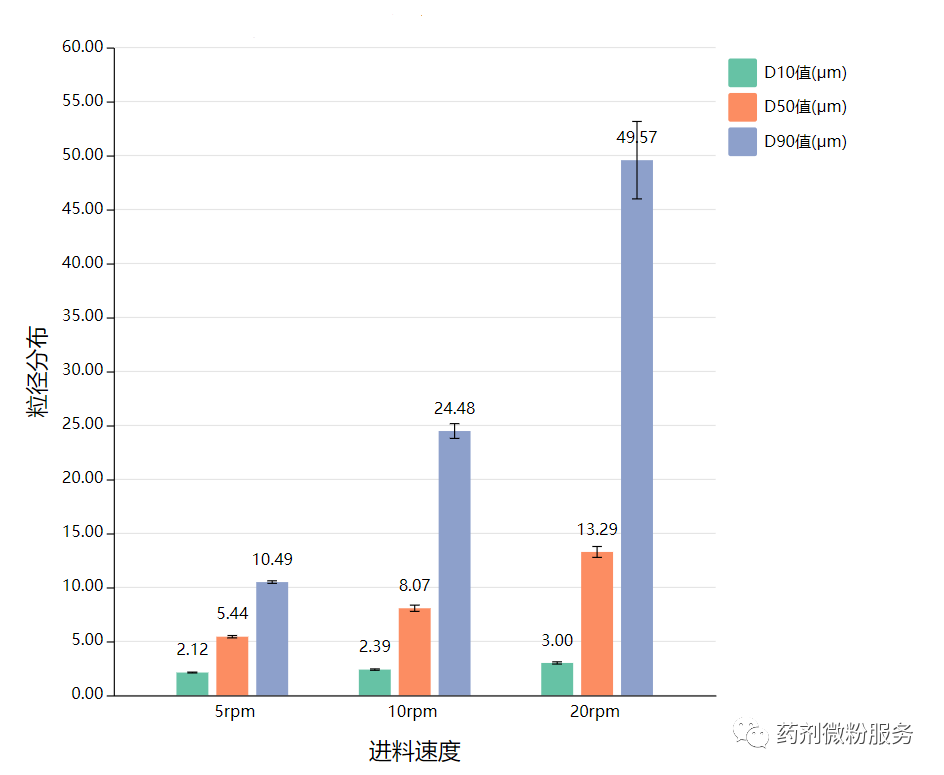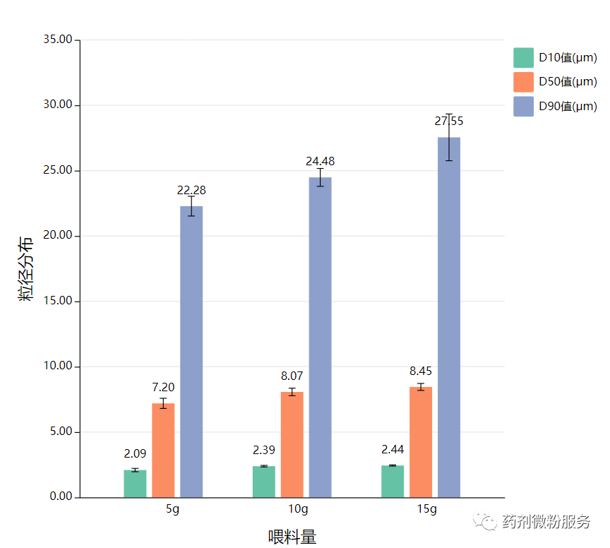 諾澤流體科技(上海)有限公司的氣流粉碎機采用的是水平式的雙螺桿進料器,通過馬達轉動帶動螺桿的運動,從而推送物料進入粉碎腔內。在恒定的轉速條件、粉碎壓力條件下,通過對不同重量物料進行粉碎處理,可以看到粒徑分布的規律:隨著喂料量的增大,粒徑分布有增長的趨勢。