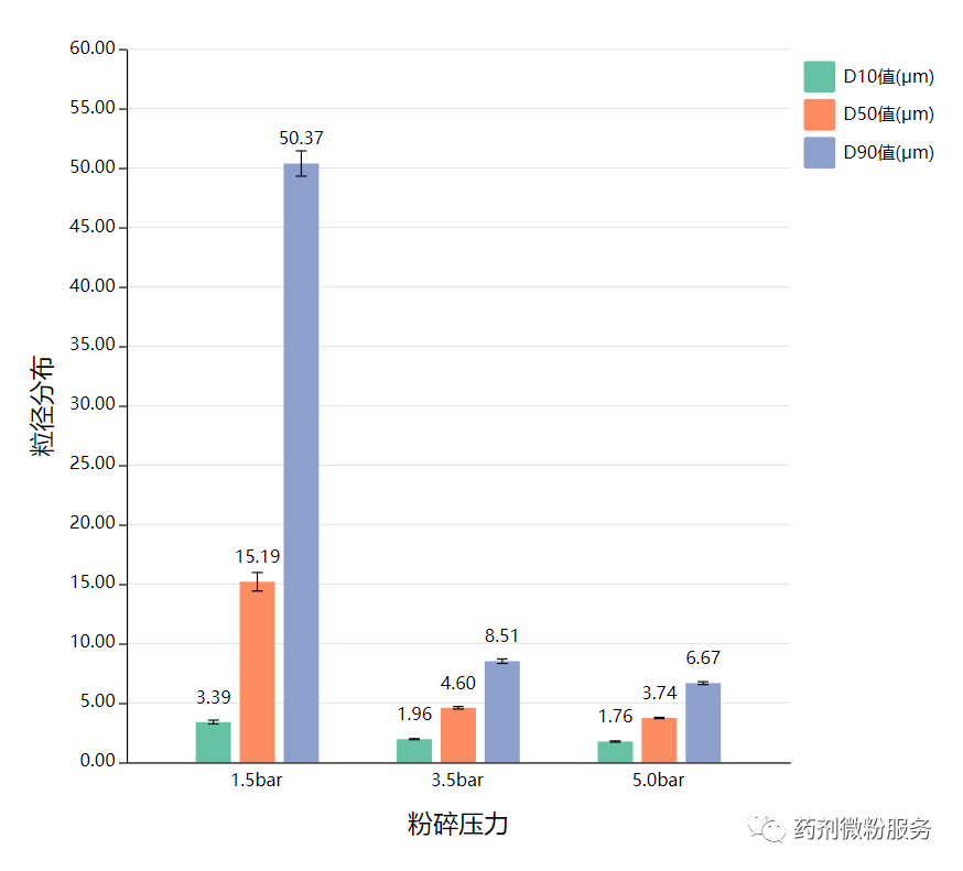 進料壓力通常要高于粉碎壓力0.5bar到1.0bar之間,是為了避免文丘里管處的物料回流到喂料器中[3]。當進料壓力過高時,來自文丘里管的氣流會擾亂粉碎腔內的螺旋氣流,這時會導致粉碎腔出口處的產品粒徑較大。