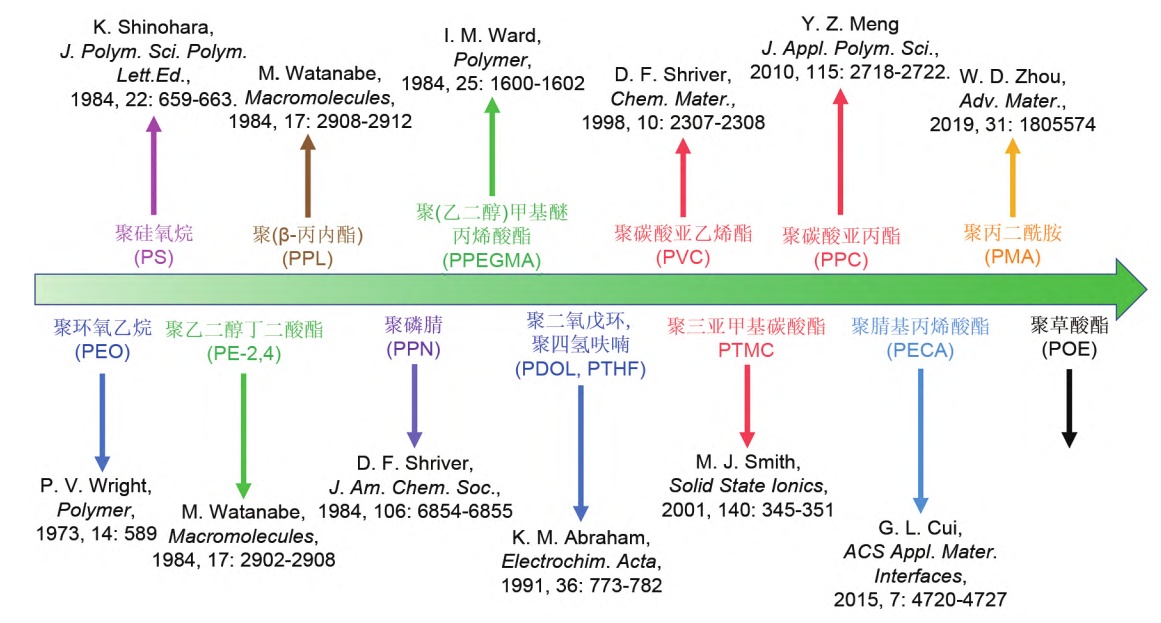 聚合物固態(tài)電解質(zhì)的研究可以追溯至19世紀(jì)80年代,Wright等人首先提出聚氧化乙烯可以溶解堿金屬鹽并形成離子導(dǎo)電聚合物,由于陽離子與聚合物主鏈中醚氧原子的配位隨著溫度變化,聚合物的電導(dǎo)率呈現(xiàn)溫度依賴性。