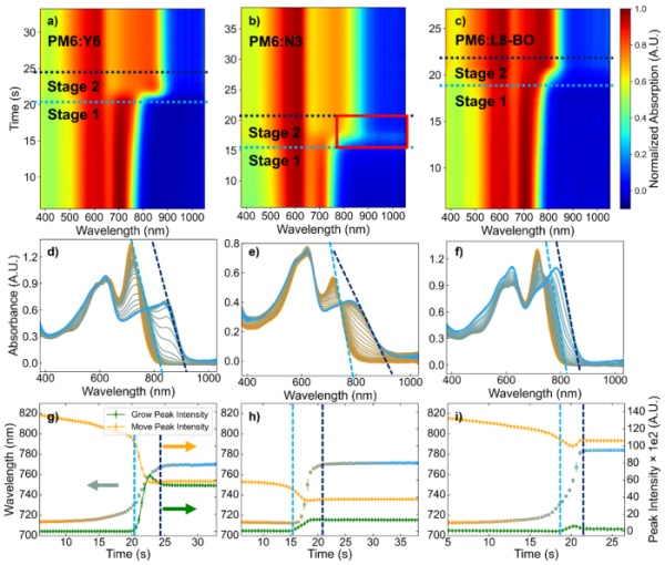 圖1. 原位光譜表征結果。(a-c)原位光譜瀑布圖;(d-f)光譜疊圖;(g-i)生長-移動模型擬合光譜演化結果。